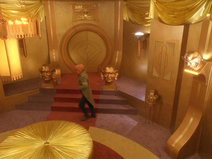 tiene esculpida una cabeza ferengi hecha de oro en su extremo y se